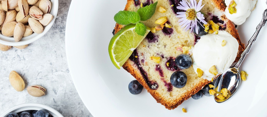 Hoy te propongo una receta con diferentes contrastes de sabor que, seguro, despertará las papilas gustativas tanto de niños como de mayores: bizcocho (o “coc”, como lo llamamos en el Delta) con arándanos y pistachos acompañado de helado de yogur natural y limón de La Fageda.